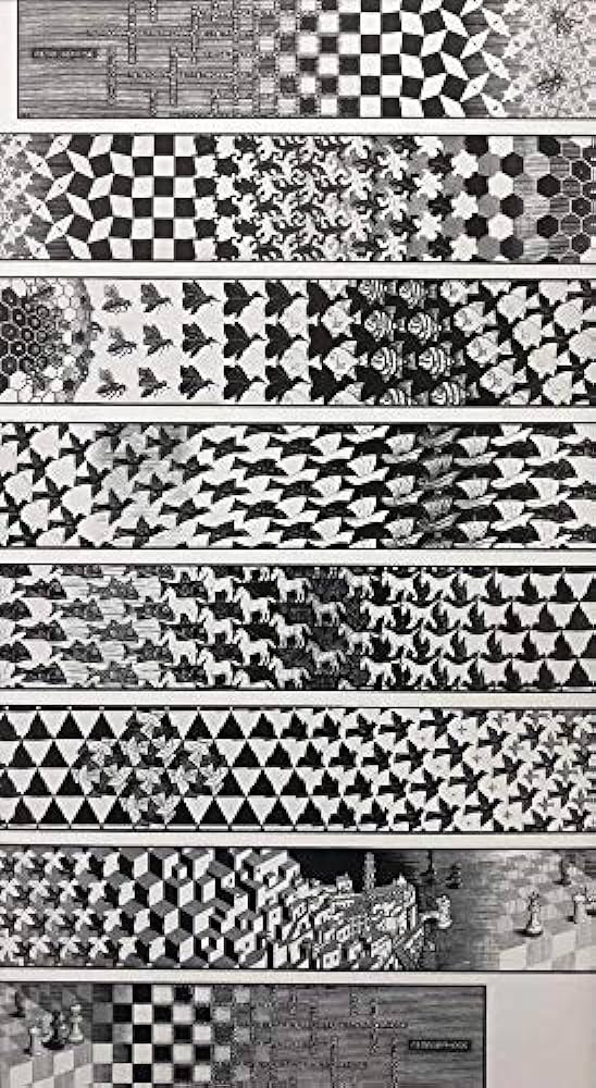 The work of Escher can be broadly divided into two themes: eternity and perpetuity of then through continuous and subtle transformation or metamorphosis. A metamorphosis is a change in appearance, mood, or character and can be literal or metaphorical, from a caterpillar metamorphosing into a butterfly to the metamorphosis of literary character from being selfish to selfless.